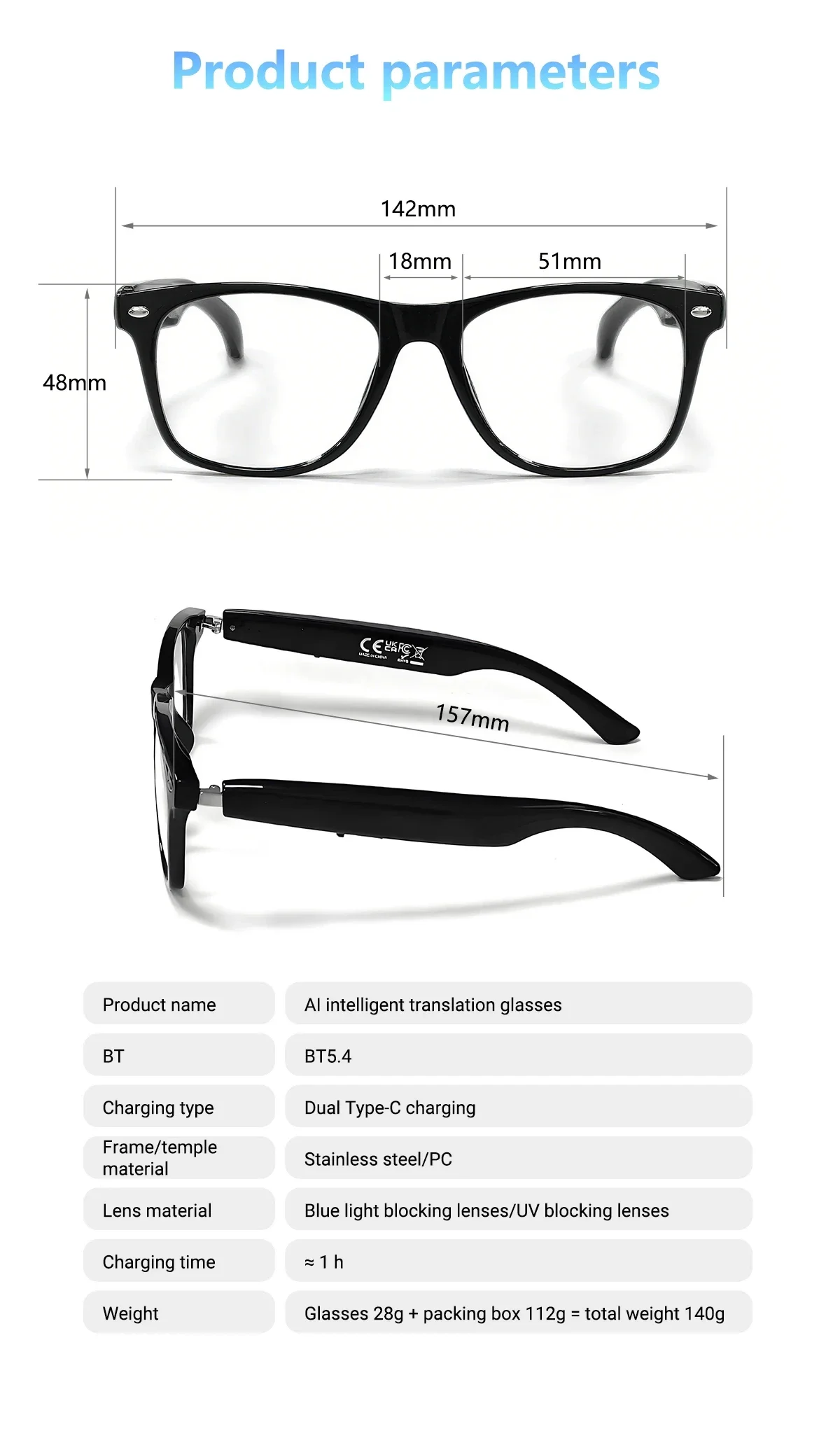Fabricadas con una montura ligera y lentes reemplazables , estas gafas inteligentes se adaptan fácilmente a diferentes necesidades y estilos. Su diseño equilibrado las hace cómodas para un uso prolongado, mientras que su compatibilidad con una amplia gama de idiomas y usos garantiza flexibilidad para usuarios de todo el mundo.