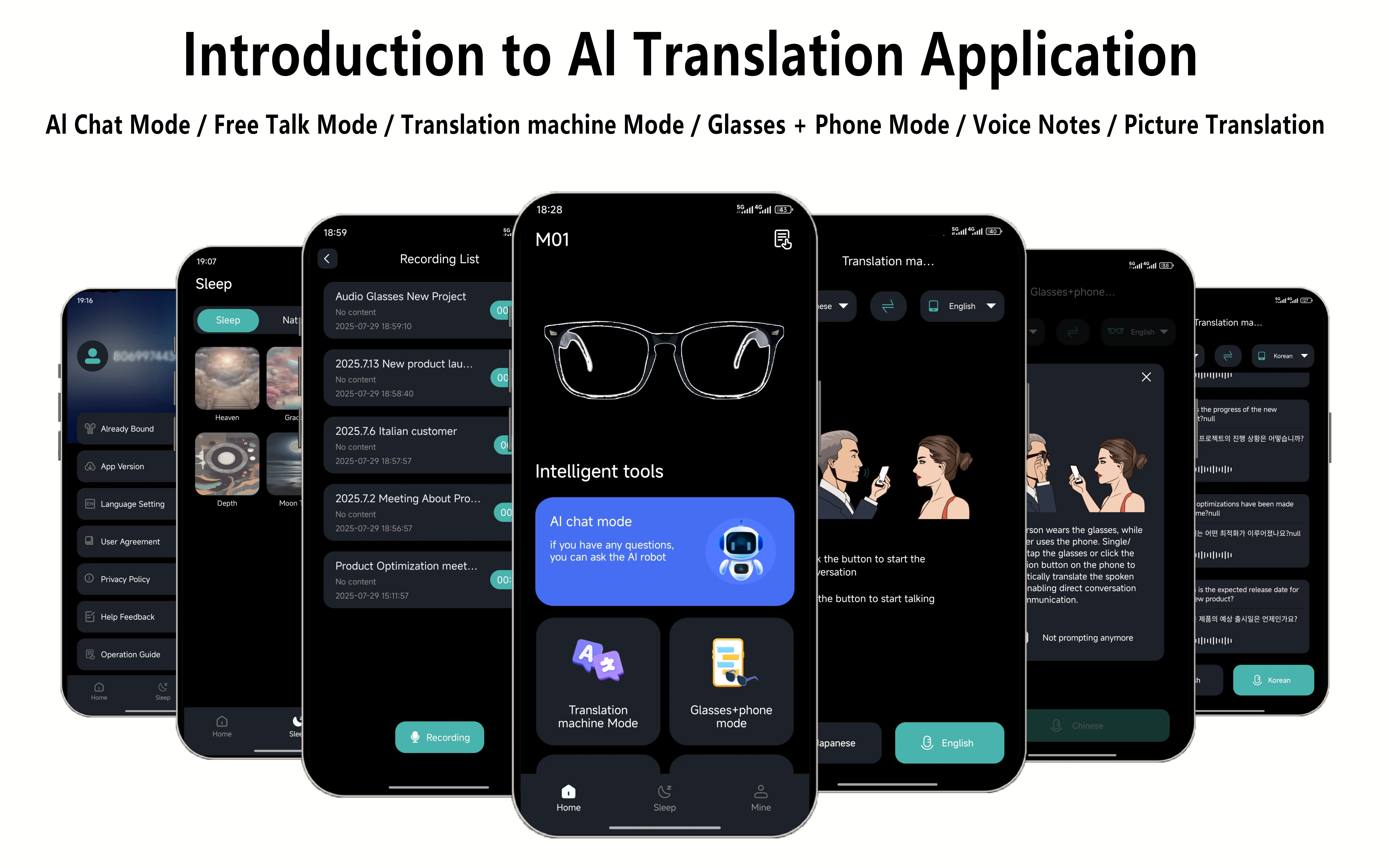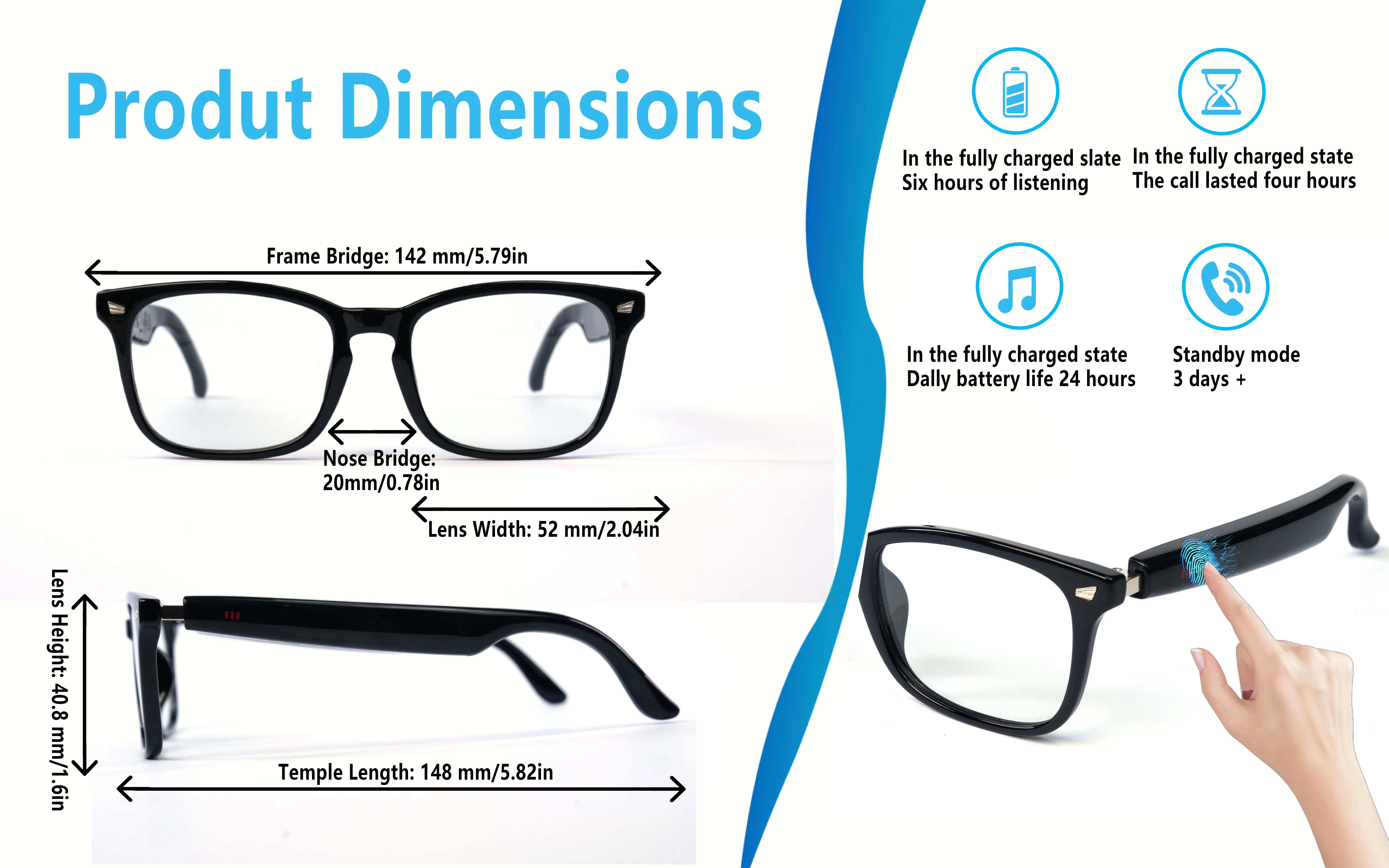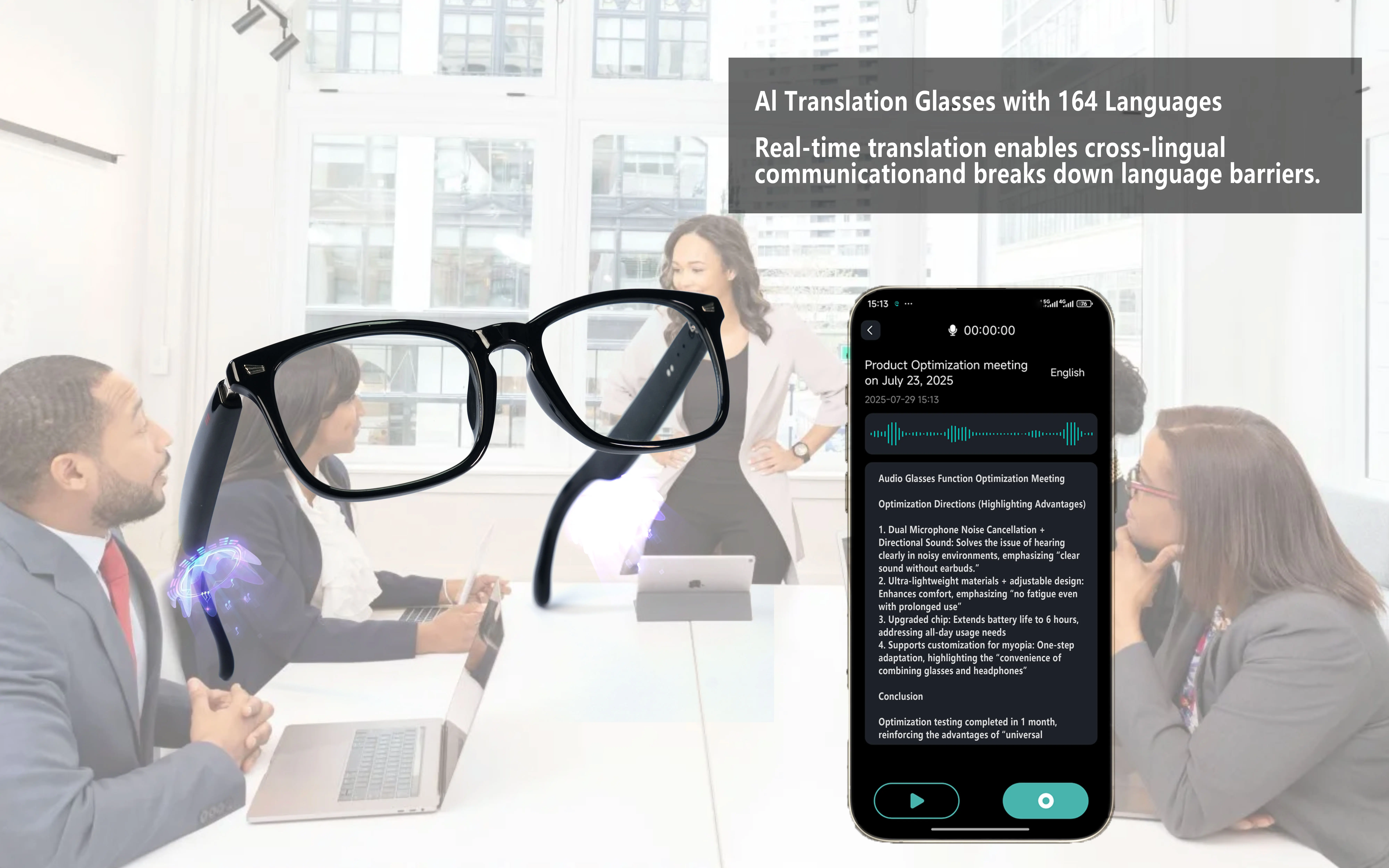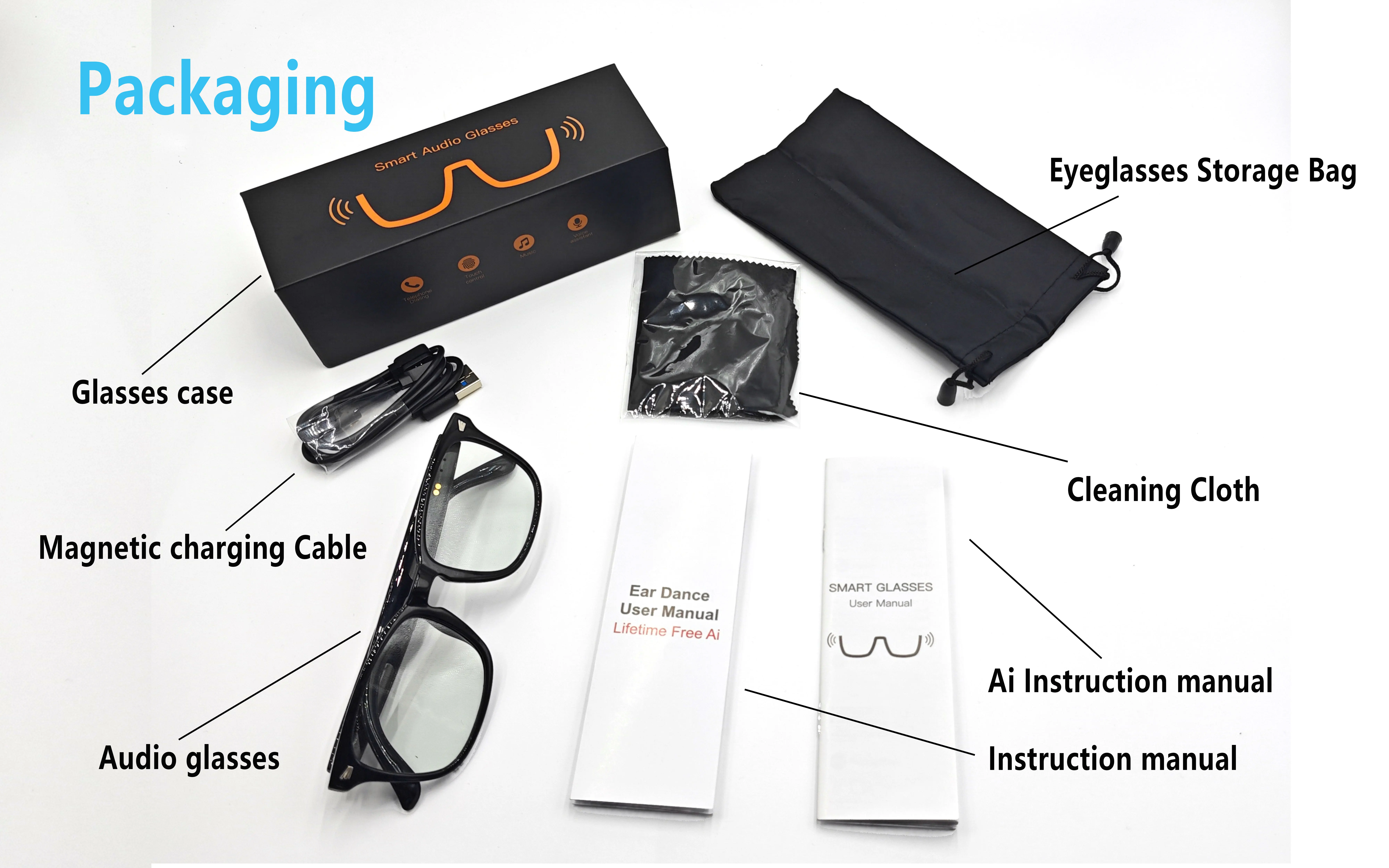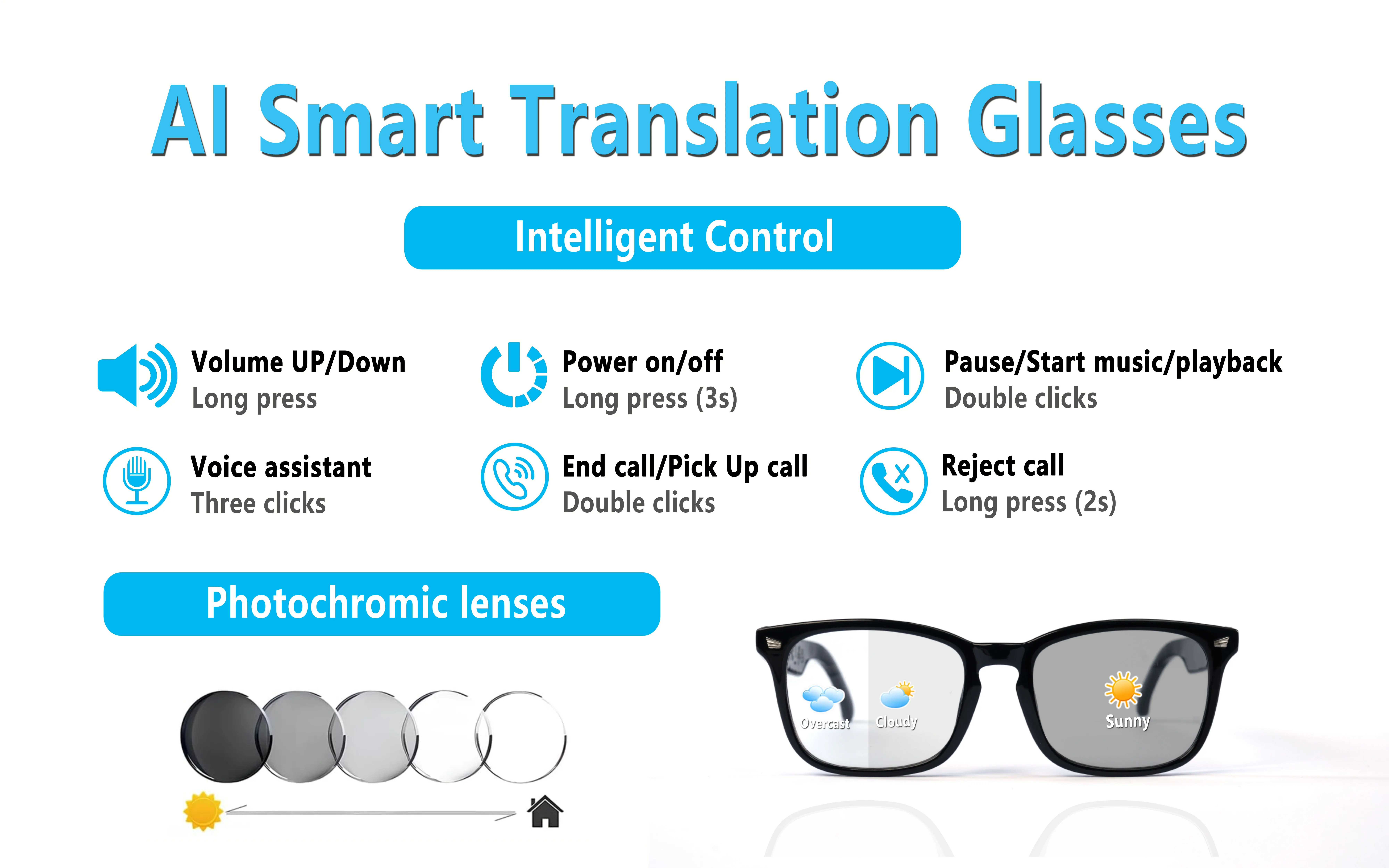 Gafas inteligentes, traducción de aplicaciones, lentes que cambian de color, llamadas de voz de alta definición, calidad de música Hi-Fi, gafas de audio de oído abierto.