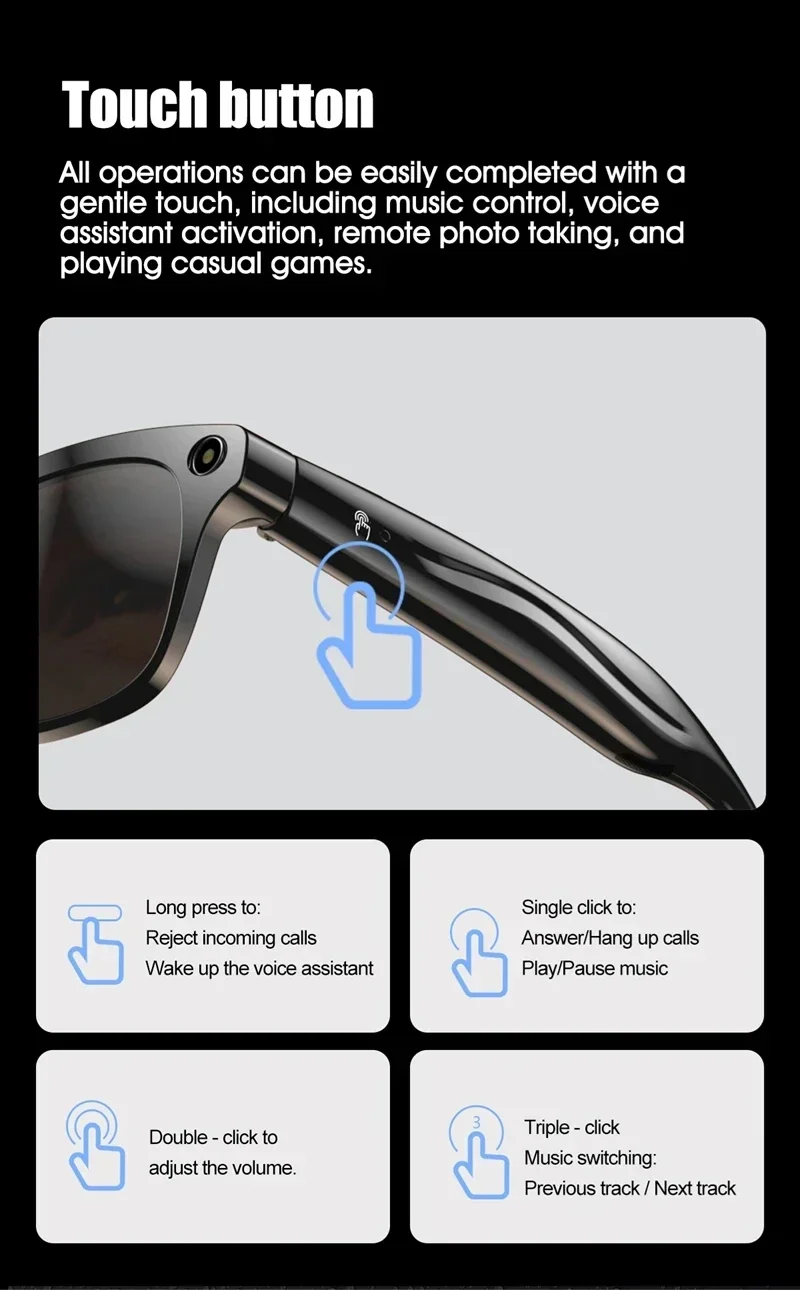 Restez connecté où que vous soyez. Grâce au Bluetooth intégré, passez des appels, écoutez de la musique ou recevez des notifications directement depuis les lunettes. Profitez d'un son immersif sans écouteurs : elles sont idéales pour le sport, les trajets quotidiens ou une utilisation quotidienne.