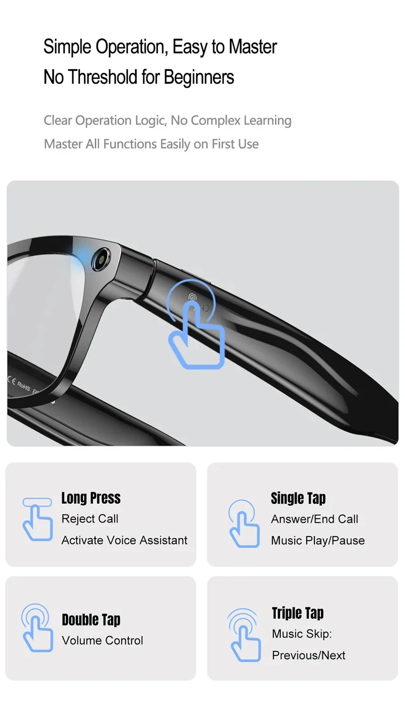 Dotées d'une batterie de 260 mAh , ces lunettes connectées sont conçues pour un usage quotidien. Des fonctionnalités supplémentaires, telles qu'une lampe torche LED intégrée , un écran tactile et des montures interchangeables, offrent flexibilité et durabilité. Leur design moderne et léger garantit un confort optimal tout en conservant une allure haut de gamme.